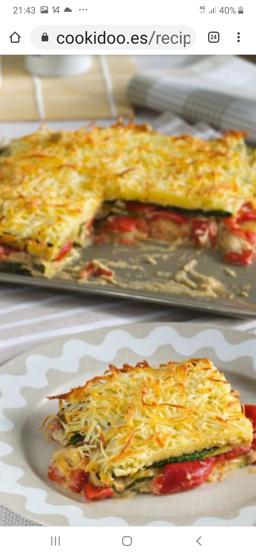 En una fuente de horno de aprox. 20x30 cm, ponga una capa de láminas de calabacín. Reparta encima el paté de berenjenas, ponga encima otra capa de calabacín y una capa de pimientos, otra de calabacines y, por último, espolvoree con el queso rallado.