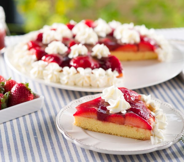 - Desmolde el bizcocho y colóquelo boca abajo en un plato para tartas. Coloque encima las fresas (con la parte cortada hacia abajo) y riegue con el líquido que haya quedado en el bol. Con una cuchara, ponga poco a poco la mermelada del vaso sobre la tarta, procurando que quede bien cubierta. Reserve en el frigorífico hasta que la gelatina haya cuajado completamente (aprox. 1 hora).