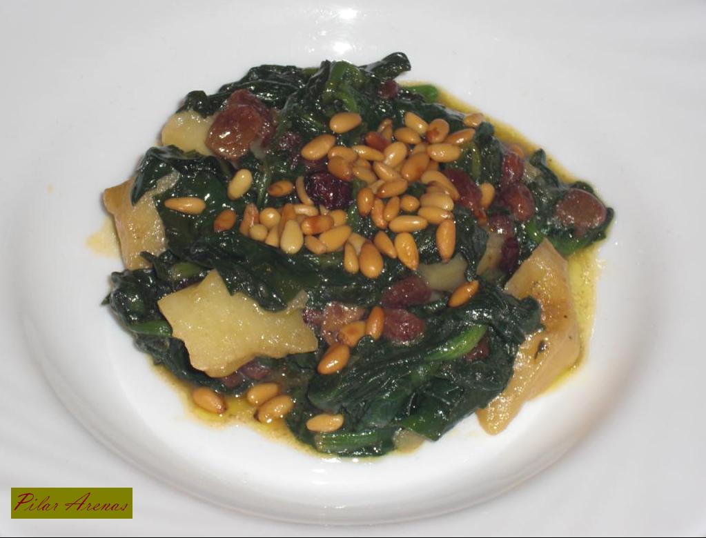 - Mezcla las patatas con las espinacas y sirve adornando con los piñones.