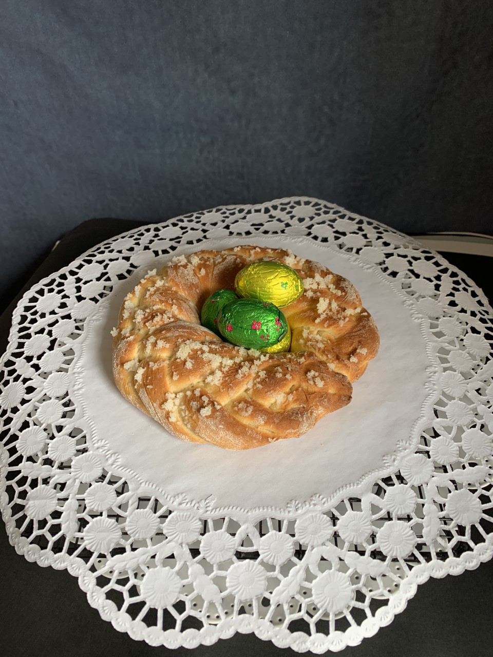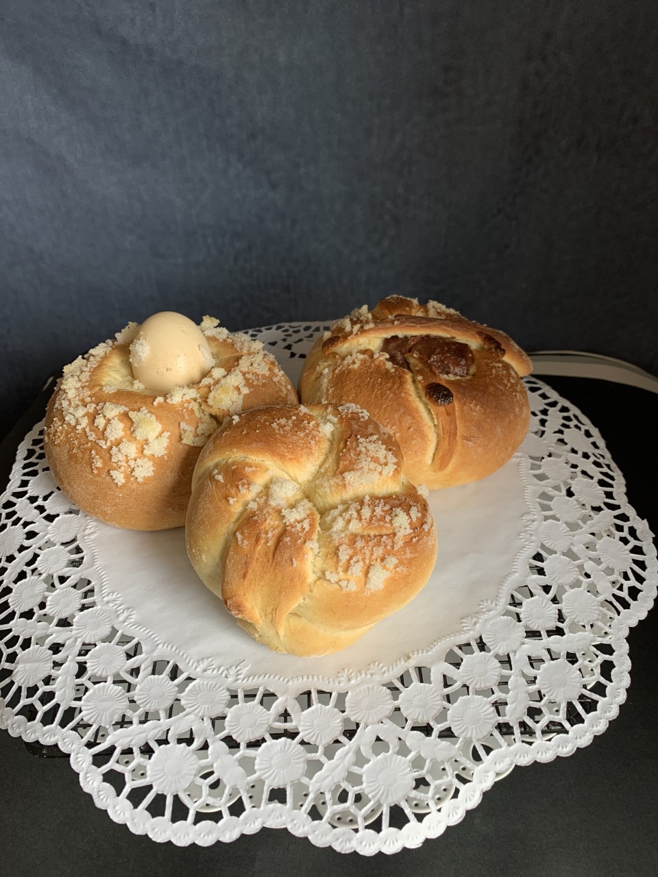 Forme primero una bola con la masa y le das la forma redonda, o en este caso una trenza,o figuras al gusto, y le ponemos un huevo en el centro