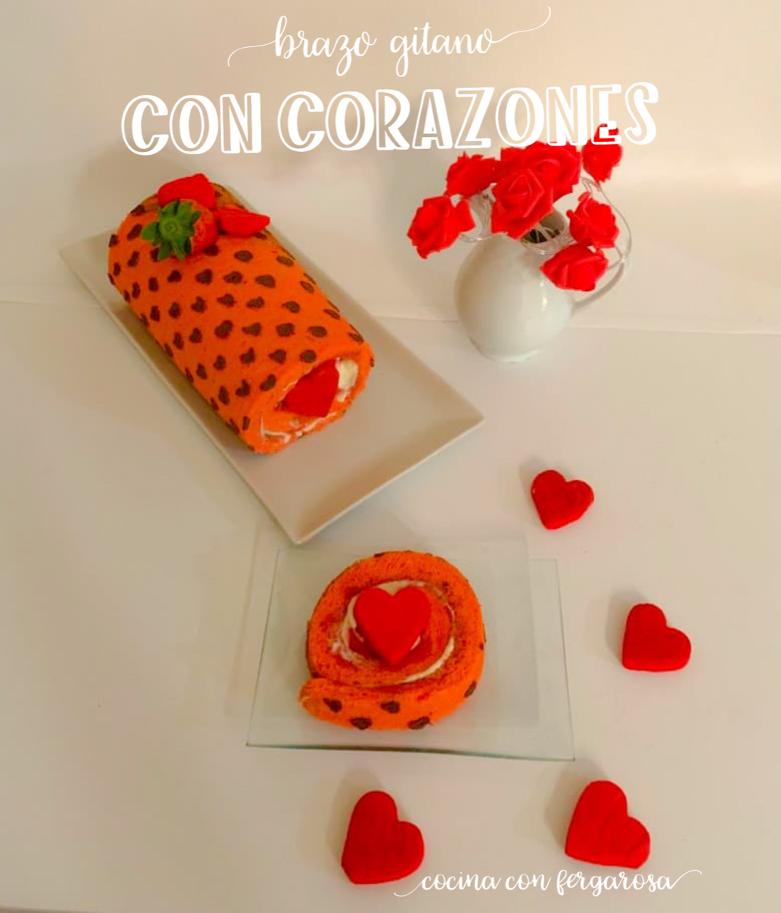 Cambiamos el papel de horno para darle la vuelta para que queden los corazones por arriba y luego se vea el brazo gitano bonito, y lo enrollamos para que coja la forma de brazo de gitano. Reservamos