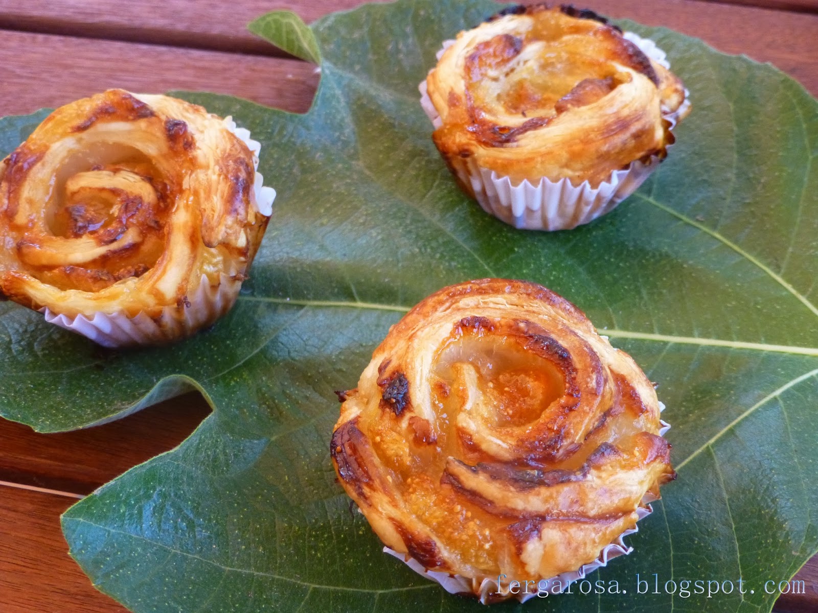 Espolvorear la superficie de trabajo con harina. .Estirar la masa hojaldre y con ayuda de un cortapizza hacer 6 tiras. Colocar en un extremo de cada tira de masa un higo entero y repartir rodajas en el resto de tira. Enrollar empezando por la parte del higo entero